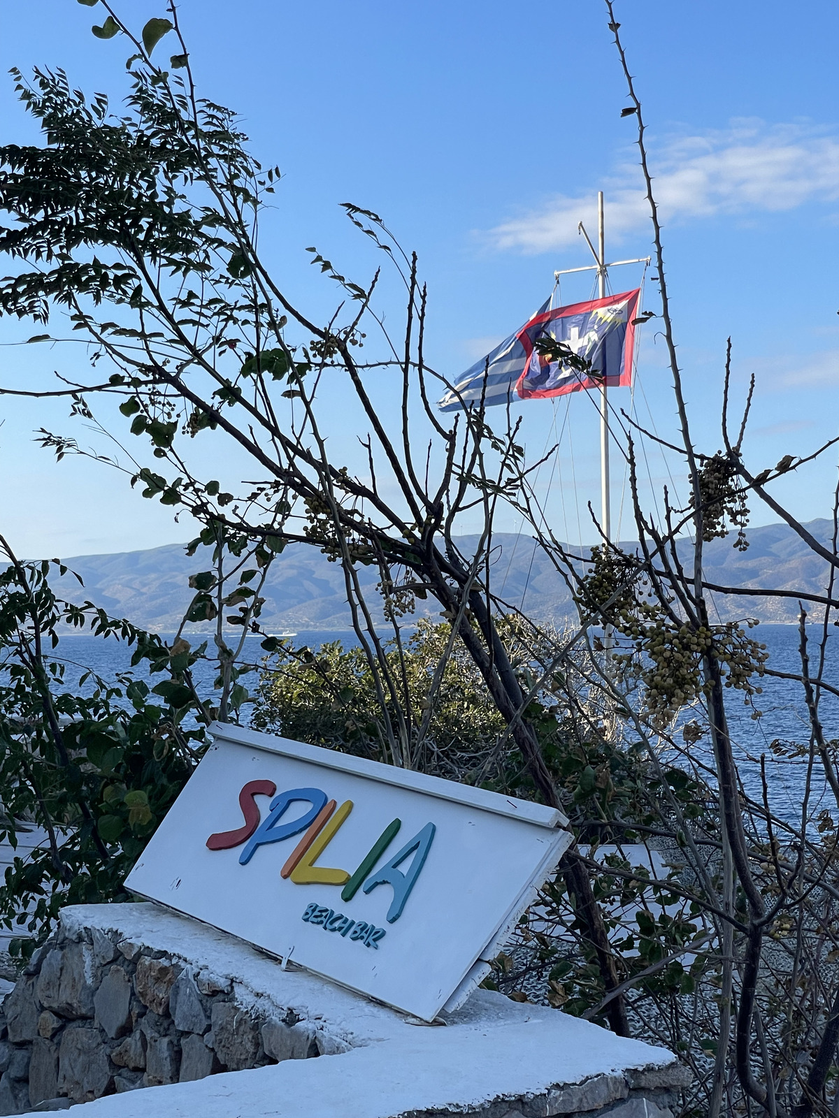 My first beach to visit was, of course, the Spilia Beach Bar, the one with a cave :-) Its coordinates are N 37.353522 E 23.485235. The beach is kind of a misnomer, as there's only a ladder to descend to the sea, several around the beach bar area and towards west. Not easy to get to the water, and if there's any wave action going on, it may be difficult to get back. as well. Be careful here. But, there's a cave...
