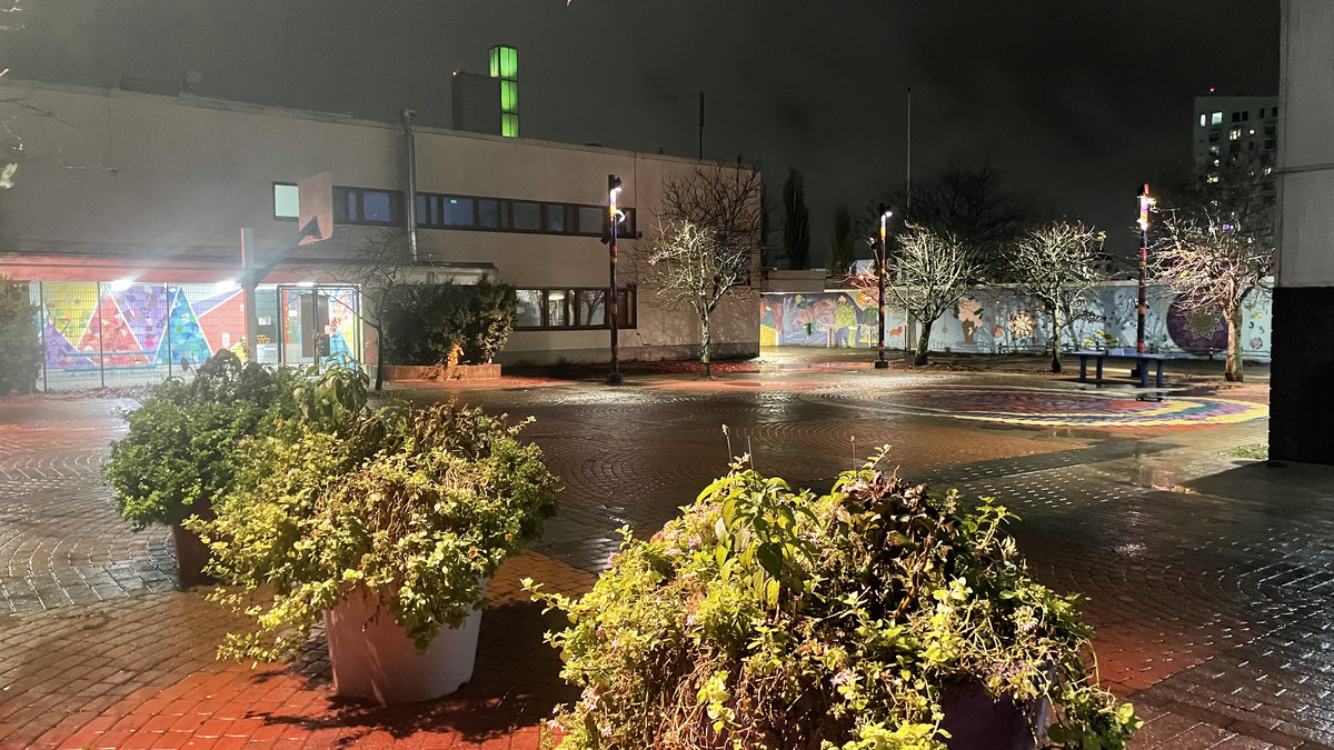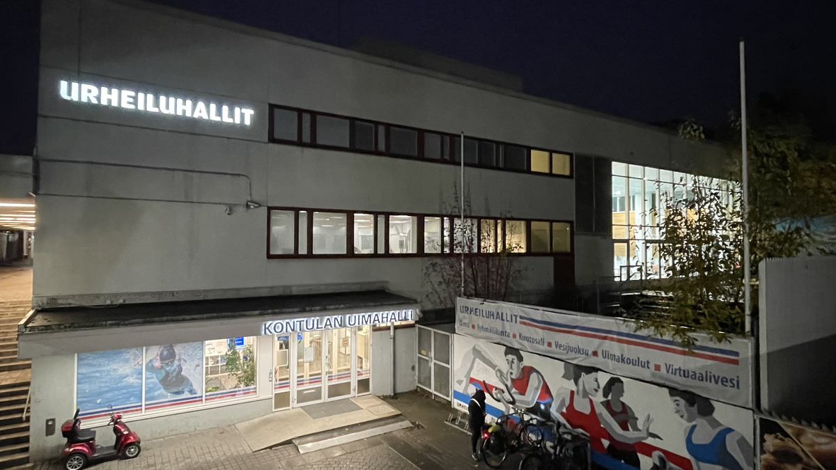 Kontula swimming hall. Mixed feelings, a wonderful pool area. Is it new? Run by Urheiluhallit who usually run excellent facilities, very nice! Not so flashy dressing room and saunas/showers area, but ok. But outside... darkness, rain, suspicious people standing in the dark in the rain in the park as I walk by... gangs having some kind of fight, not sure how serious. Anyway, I am not usually afraid almost anywhere in the world, but now I felt a bit insecure here.