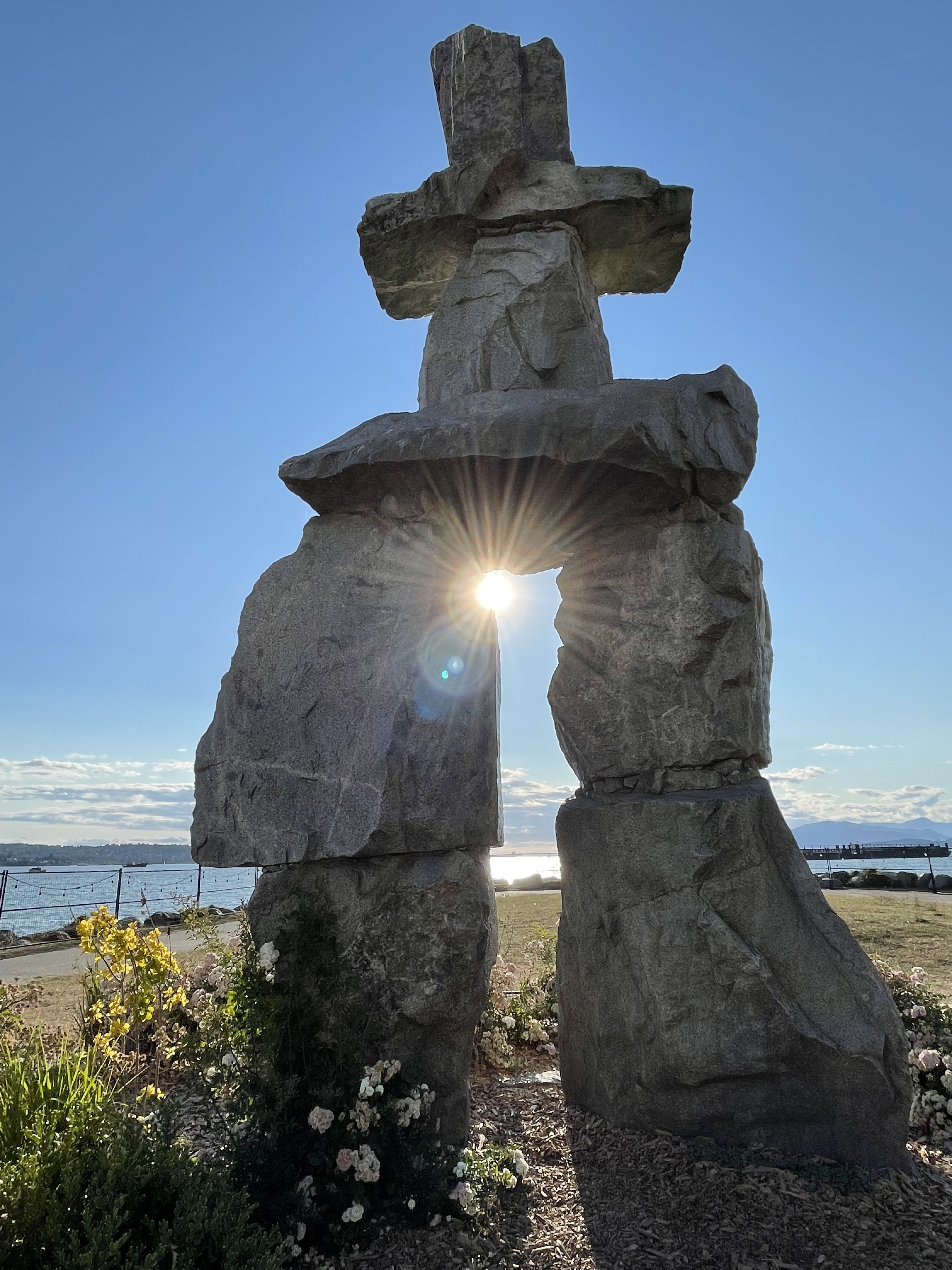 Inukshuk point (link, coordinates N 49.28431 W 123.14373), a rock tower erected in honor of the Inuit ("This ancient symbol of the Inuit culture is traditionally used as a landmark and navigational aid and also represents northern hospitality and friendship"):